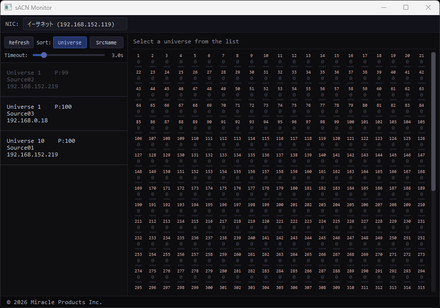 ・使用方法は、フォルダに同梱している「sACN_Monitor_Alpha_README」を参照してください。