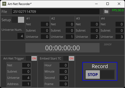 PCを使ってArt-Net を記録・再生するシステムです。 再生/停止。及び任意の箇所から再生できるスクラブ操作が備わった手動再生モードと タイムコードに同期する同期再生モードがあります。 同期再生モードでは、複数回に分けて記録した複数のデータに(例:曲毎のデータ)、 それぞれ異なるスタートタイムを指定して1つのショーを構築する事ができます。 記録モード 手動再生モード 同期再生モード お問い合わせ