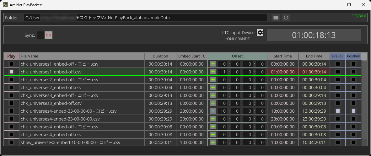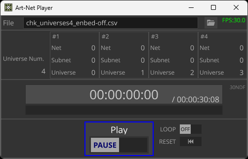 PCを使ってArt-Net を記録・再生するシステムです。 再生/停止。及び任意の箇所から再生できるスクラブ操作が備わった手動再生モードと タイムコードに同期する同期再生モードがあります。 同期再生モードでは、複数回に分けて記録した複数のデータに(例:曲毎のデータ)、 それぞれ異なるスタートタイムを指定して1つのショーを構築する事ができます。 記録モード 手動再生モード 同期再生モード お問い合わせ